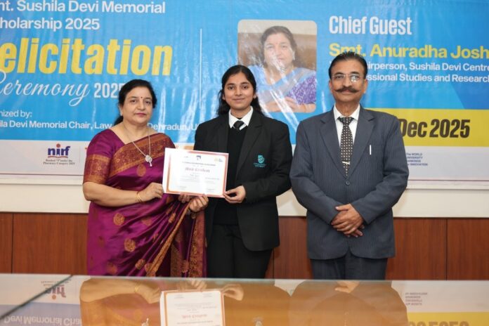 देहरादून 30 दिसम्बर। उत्तरांचल विश्वविद्यालय के लाॅ काॅलेज देहरादून में अपनी-अपनी कक्षा में सर्वाधिक अंक प्राप्त करने वाले छात्रों को सुशीला देवी मेमोरियल छात्रवृति से नवाजा गया। विश्वविद्यालय संचालन समिति की उपाध्यक्षा श्रीमती अनुराधा जोशी इस अवसर पर बतौर मुख्य अतिथि उपस्थित थी। उन्होंने छात्रों को छात्रवृति के चेक व सम्मान पत्रों से नवाजा।
