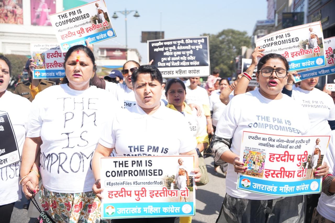 प्रधानमंत्री नरेन्द्र मोदी एवं केन्द्रीय मंत्री हरदीप पुरी का नाम एपस्टीन फाईल में उजागर होने पर हरदीप पुरी के इस्तीफे की मंाग को लेकर आज प्रदेश महिला कांग्रेस अध्यक्ष श्रीमती ज्योत रौतेला के नेतृत्व में महिला कंाग्रेस कार्यकर्ताओं ने प्रदेश कांग्रेस कार्यालय राजीव भवन से गांधीपार्क-घंटाघर-पल्टन बाजार होते हुए तहसील चौक एवं वापस प्रदेश कांग्रेस कार्यालय तक **THE PM IS Compromised** लिखी विषेश पोषाक पहनकर विरोध-प्रदर्शन के साथ मार्च निकाला तथा केन्द्रीय मंत्री हरदीप पुरी के इस्तीफे की मांग की।