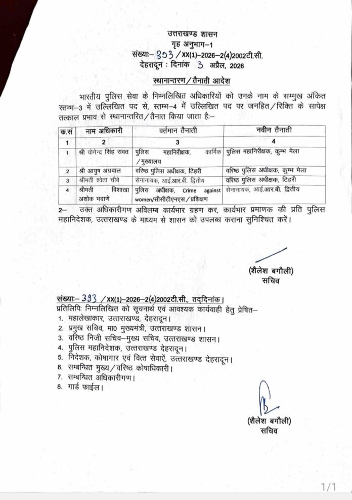 3 अप्रैल 2026 को जारी आदेश में 4 आईपीएस अधिकारियों की जिम्मेदारियों में बदलाव किया गया है। माना जा रहा है की आगामी कुंभ मेले को ध्यान में रखते हुए यह तबादले किए गए हैं।