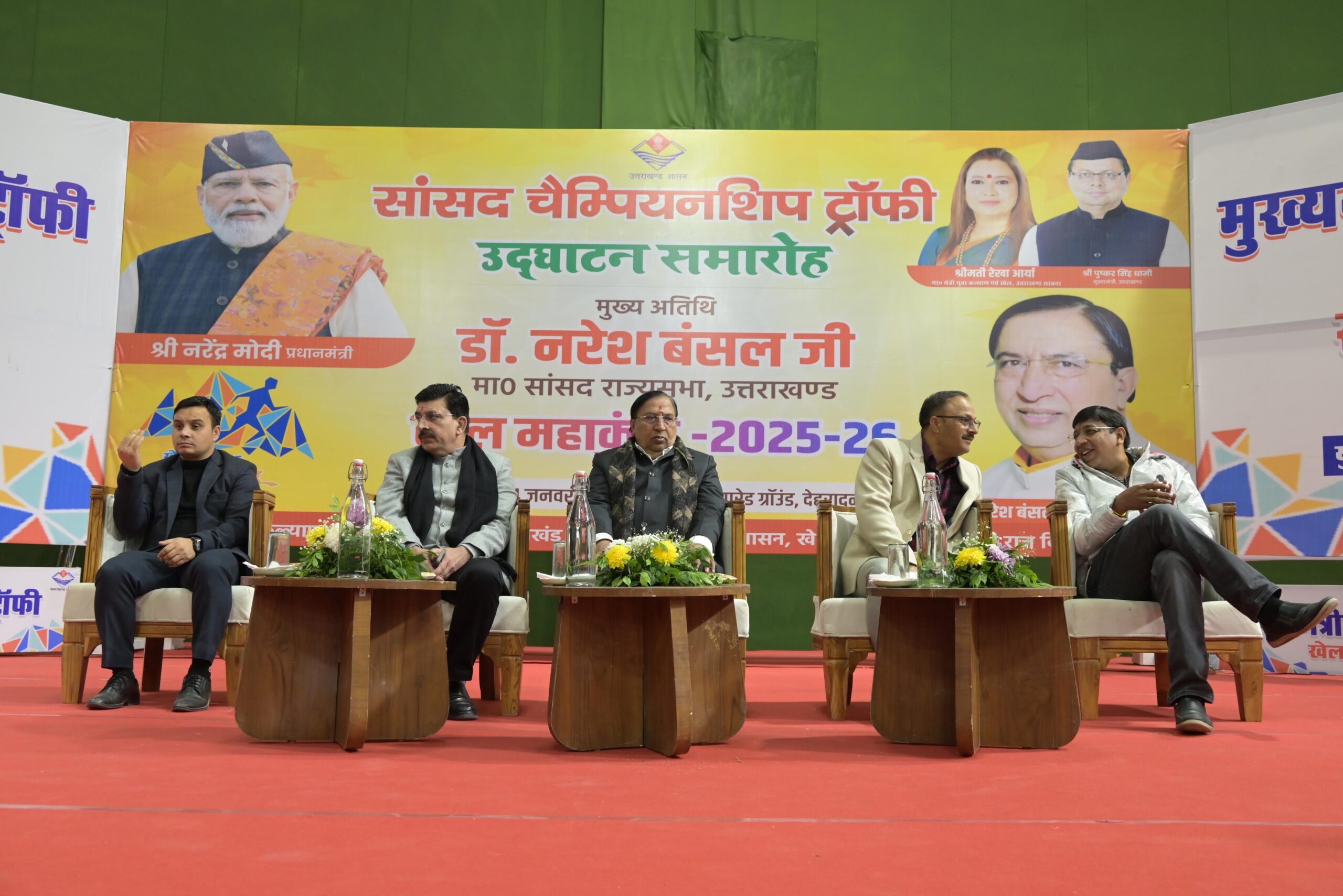 देहरादून में आज बुधवार को ग्राउंड के बहुउद्देश्य हॉल में सांसद चैंपियनशिप ट्रॉफी का जोशीला आगाज हुआ।इस प्रतियोगिता में जिले की विभिन्न विधानसभा के खिलाड़ी भाग ले रहे हैं।ट्रॉफी का अनावरण,खेलो का ध्वजारोहण और मशाल को प्रज्ज्वलित करके प्रतियोगिता का शुभारंभ राज्यसभा सांसद डा. नरेश बंसल ने किया।