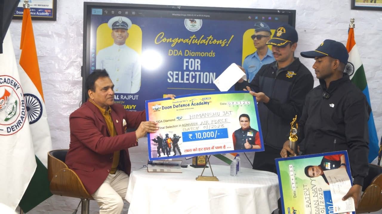 देहरादून। देश की प्रतिष्ठित रक्षा शिक्षण संस्थान, ‘दून डिफेंस एकेडमी’ (DDA) https://doondefenceacademy.com ने एक बार फिर अपने नाम को सार्थक करते हुए भविष्य के योद्धाओं के सम्मान में एक विशेष कार्यक्रम आयोजित किया। एकेडमी के विजनरी निदेशक संदीप गुप्ता सर ने हाल ही में भारतीय नौसेना और वायुसेना में चयनित दो जांबाज ‘DDA डायमंड्स’— विशाल राजपूत और हिमांशु जाट के साथ एक विशेष पॉडकास्ट के माध्यम से संवाद किया और उनकी उपलब्धियों के लिए उन्हें सम्मानित किया।