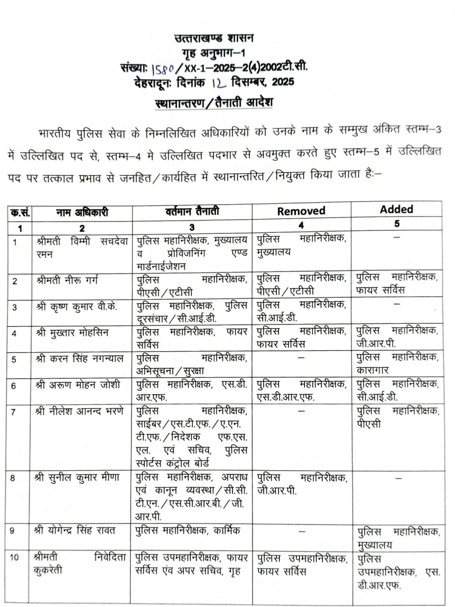 देहरादून। उत्तराखंड शासन द्वारा पुलिस महकमे में बड़ा प्रशासनिक फिर बदला करते हुए लगभग दो दर्जन वरिष्ठ आईपीएस अधिकारियों के ट्रांसफर आदेश जारी किए हैं। जारी निर्देशों के अनुसार, अधिकारियों को उनके वर्तमान पदों से अवमुक्त करते हुए जनहित एवं कार्यहित में नए पदों पर तत्काल प्रभाव से नियुक्त किया गया है।